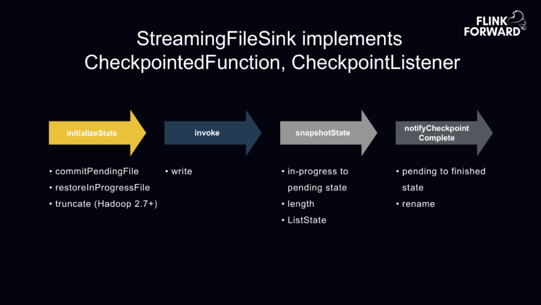 notifyCheckpointComplete 会触发 pending 到 finished state 的数据写入。实现方法是 rename,Streaming 不断向 HDFS 写入临时文件,所有动作结束后通过 rename 动作写成正式文件。