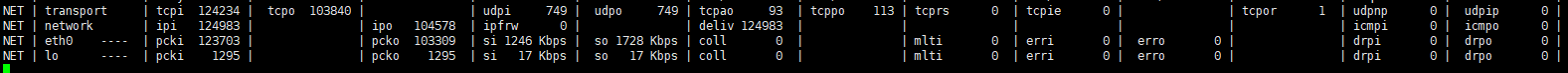 transport行统计传输层TCP和UDP协议的数据传输情况,network行统计网络层IP协议数据报的传输情况,网络接口名(如eth0,lo)行统计各个网络接口数据传输情况