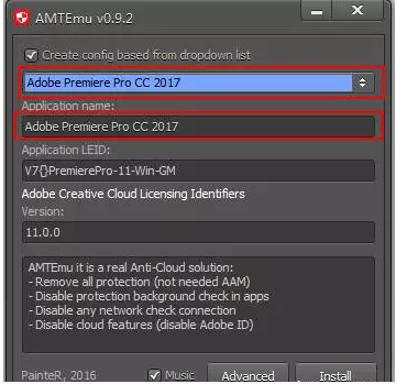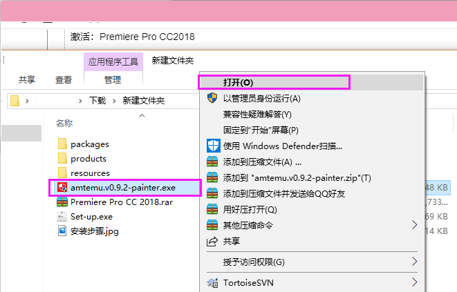 右击amtemu.v0.9.2-painter打开,第一个选项卡下找到 Adobe Premiere Pro CC2017并选中。