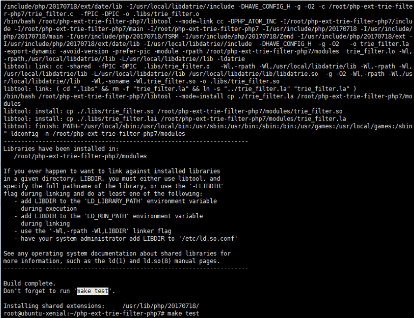 wget https://github.com/wulijun/php-ext-trie-filter/archive/master.zip unzip master.zip cd php-ext-trie-filter-master/ phpize ./configure --with-php-config=/usr/bin/php-config --with-trie_filter=/usr/local/libdatrie/ make && make installphp查找方法whereis php-config