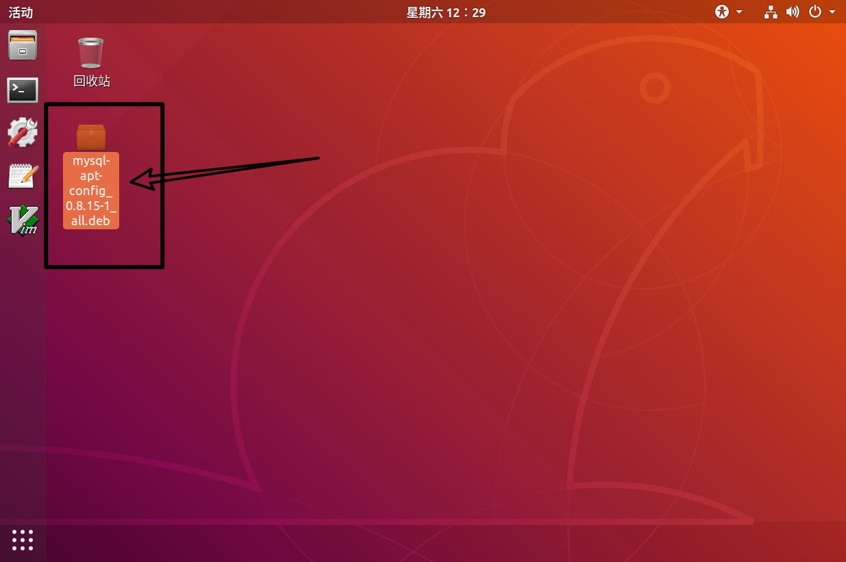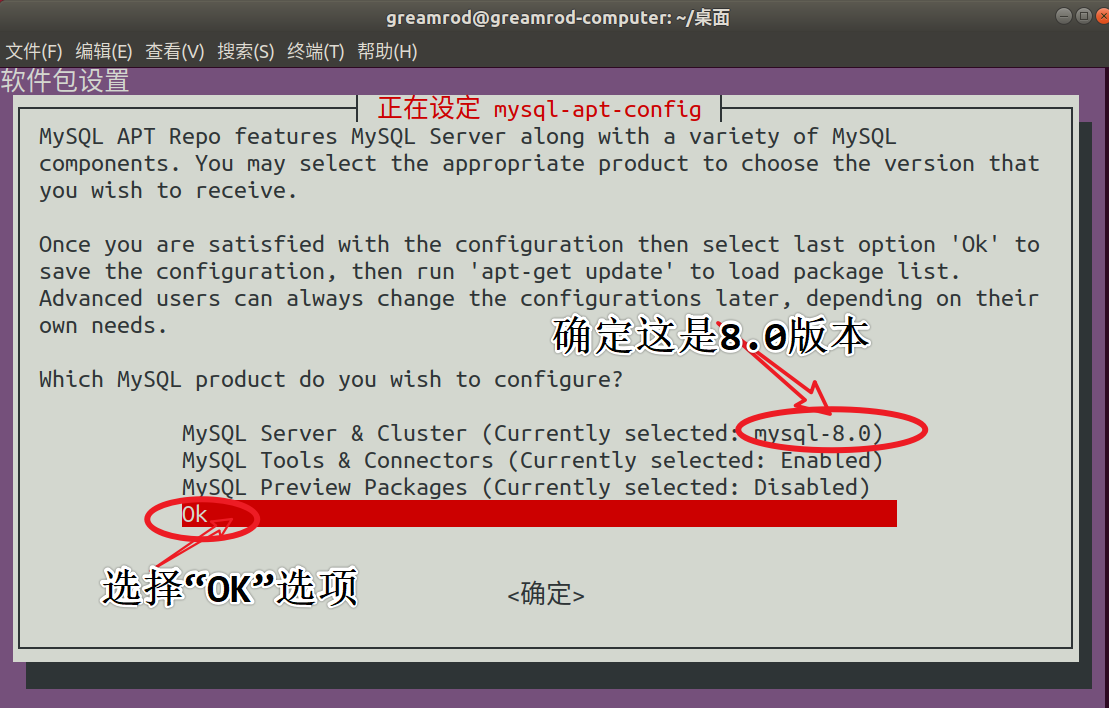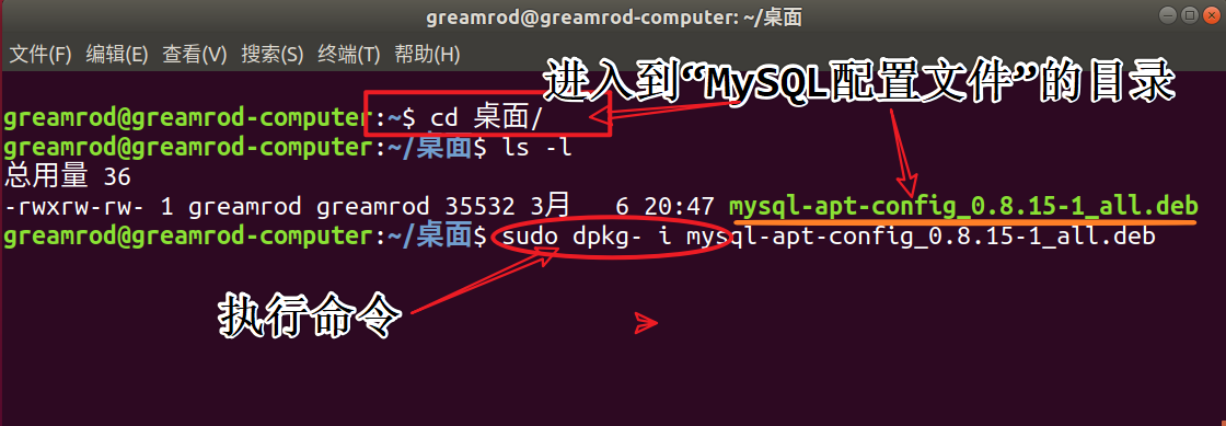 2、进入下载文件目录,打开终端,执行命令:sudo dpkg -i mysql-apt-config_0.8.15-1_all.deb