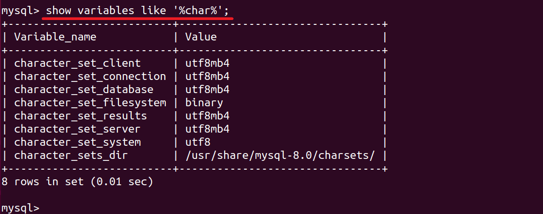 10、查看MySQL字符集,MySQL-8.0 默认为 UTF-8字符集,执行命令:show variables like '%char%';