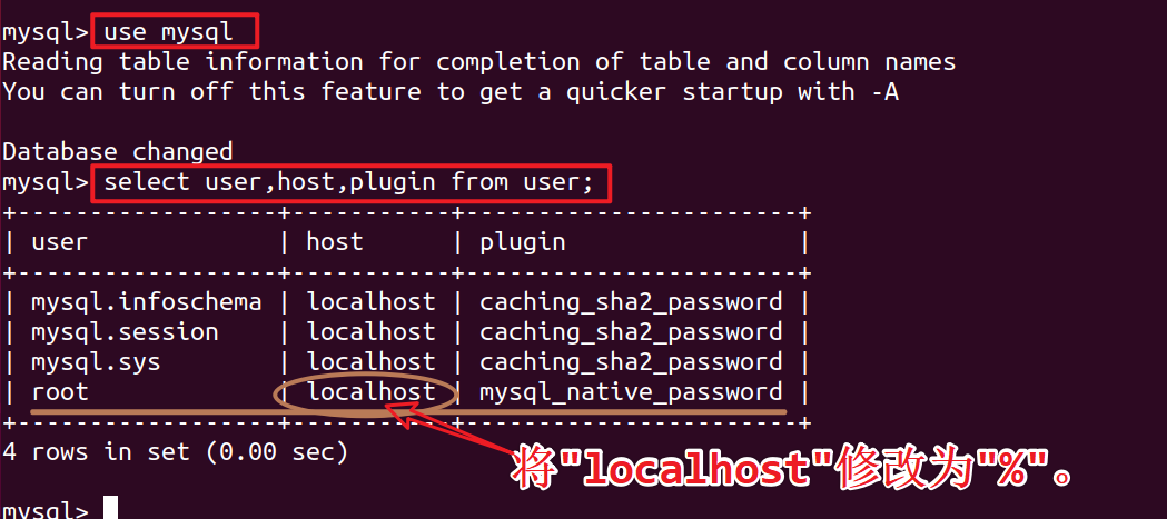 3、修改"mysql"数据库中的"user"表,执行:update user set host='%' where user='root';