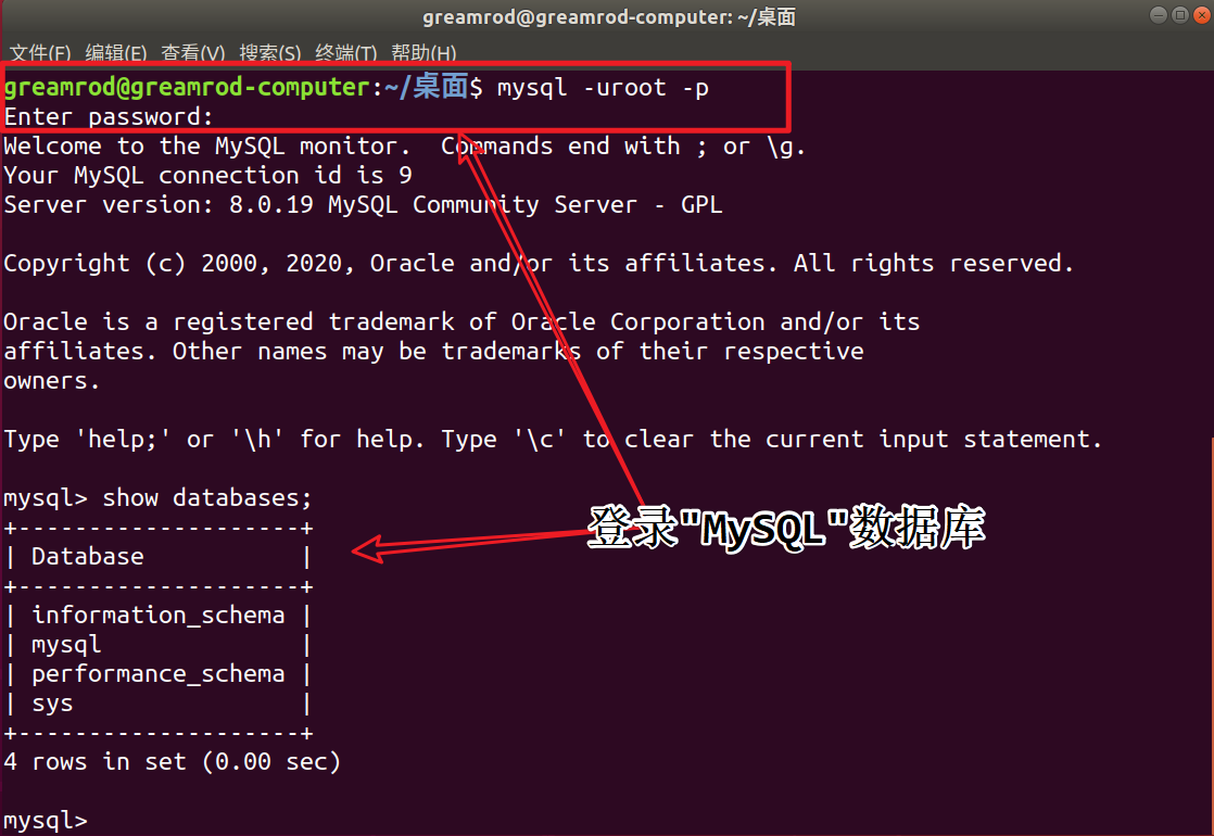 9、登录MySQL 数据库,使用命令:mysql –u root –p