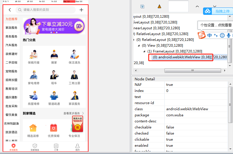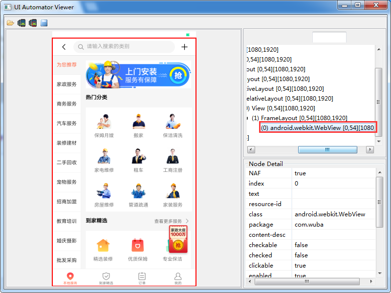 (1)使用uiautomatorviewer.bat查看页面,发现页面是WebView类型,无法定位webview中的元素