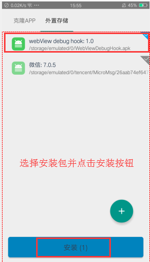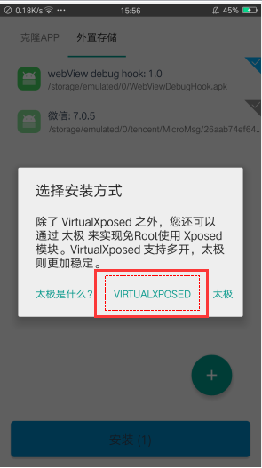 打开VirtualXposed >> 点击屏幕 >> 添加应用 >>如果本机已安装选择克隆方式,如果未安装选择内存中的apk安装 >> 依然选择VIRTUALXPOSED安装 >>安装成功