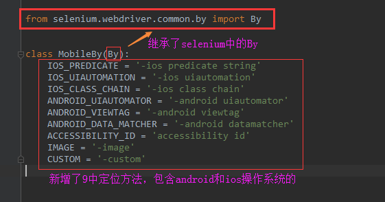 appium从selenium中继承了所有的元素定位方法,并且增加了自己的一些方法,我们先看看appium的源码:
