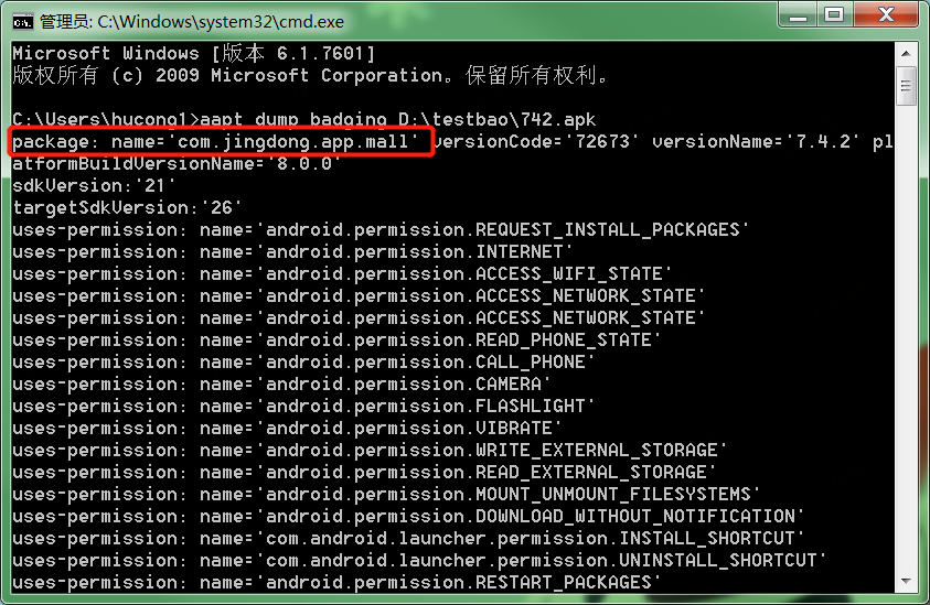 3. 如下图,以京东apk为例,package包名就获取到了: