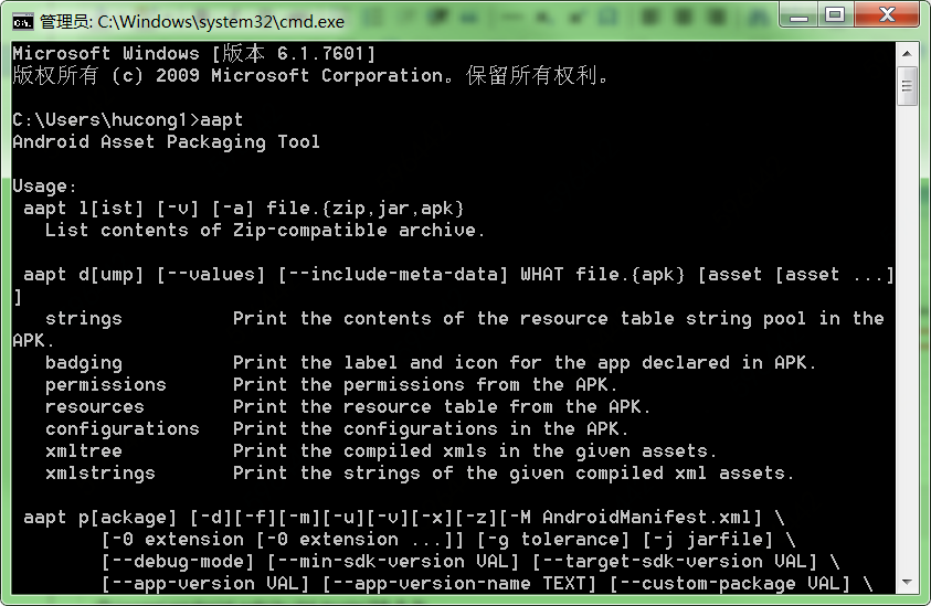 4.打开cmd,输入aapt出现如下图界面,说明环境ok了。