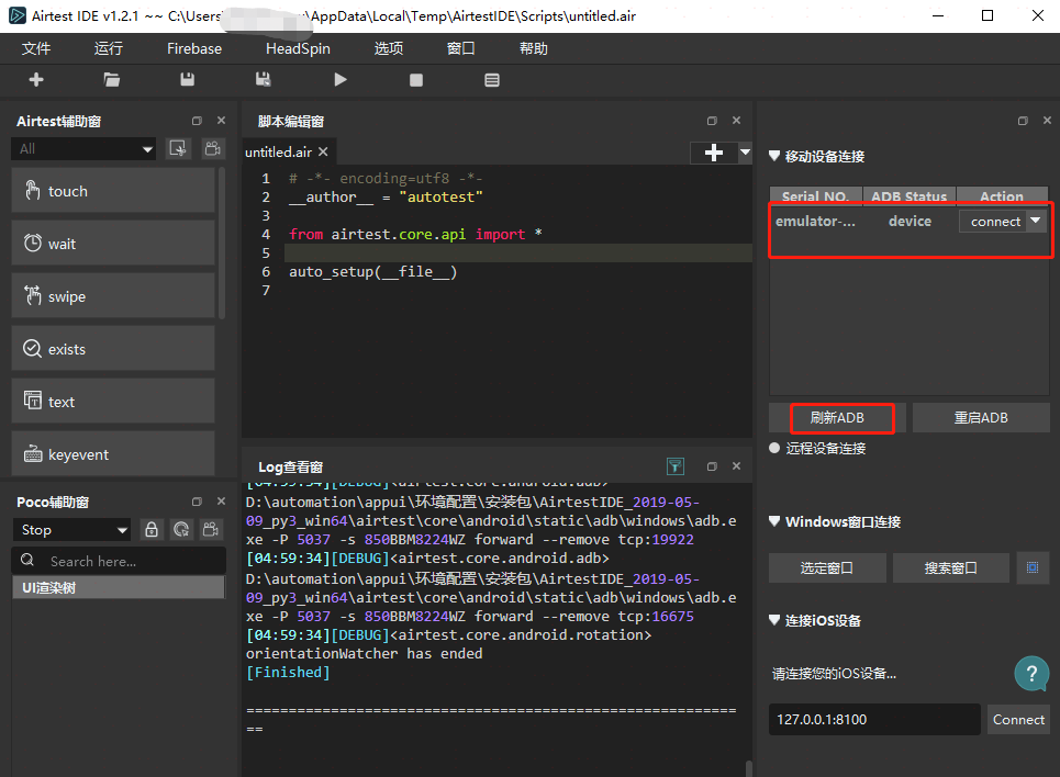 (3)在AirtestIDE设备面板中点击 "刷新ADB"按钮,查看连接上的设备