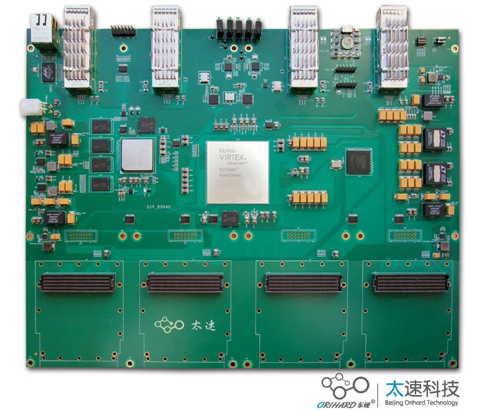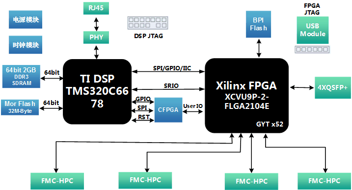 | 一、板卡概述   二、处理板技术指标 • 板卡为自定义结构,板卡大小332mmx260mm; • FPGA采用Xilinx Virtex UltralSCALE+ 系列芯片 XCVU9P; • FPGA挂载4组FMC HPC 连接器; • 板载4路QSPF+,每路数据速率40Gb/s; • DSP处理器采用TI 8核处理器TMS320C6678; • DSP 外挂一组64-bit DDR3颗粒,总容量1GB,数据速率1333Mb/s; • DSP 采用EMIF16 NorFlash加载模式,NorFlash容量32MB; • DSP 外挂一路千兆以太网1000BASE-T; • FPGA与DSP之间通过RapidIO x4互联。 三、软件 • CFPGA 加载测试代码; • CFPGA对电源、时钟、复位等控制测试代码; • CFPGA部分SPI/GPIO等接口测试代码; • DSP部分Flash加载测试代码; • DSP部分DDR3接口测试代码; • DSP网口部分测试代码; • DSP与FPGA之间SRIO测试代码; • DSP部分SPI/IIC/GPIO接口测试代码; • XCVU9P部分BPI加载测试代码; • XCVU9P部分QSFP+测试代码; • XCVU9P部分FMC搭配子卡测试代码; 四、物理特性: