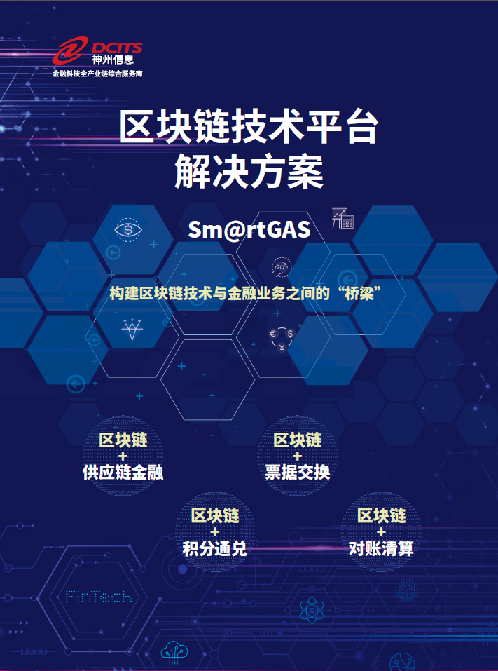 神州信息金融区块链解决方案Sm@rtGAS 基于企业级的区块链基础技术平台。该产品提供了完备、灵活的区块链应用建模能力,帮助金融机构和企业基于区块链技术构建各类金融应用。神州信息结合支付结算、数字货币、贸易融资、数字票据、商业积分等应用场景推出一整套的金融区块链综合解决方案,助力金融机构和企业实现“区块链+ 金融”的战略目标。