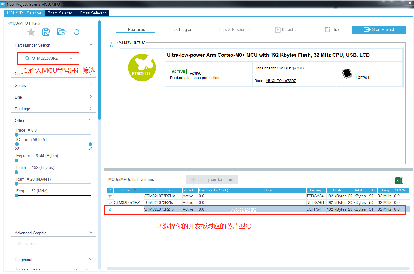 如上图所示:通过MCU筛选来找到自己开发板对应的芯片型号,双击后弹出工程配置界面,如下图: