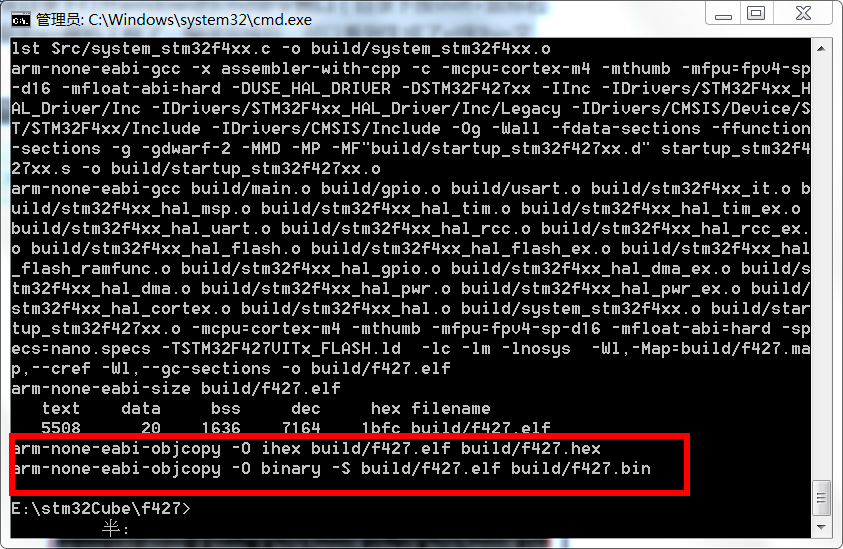 点击生成代码后,生成的裸机工程效果如下,在makefile同级目录下打开windows的cmd命令窗口(目录下按shift+鼠标右键,点击在此处打开命令窗口),输入make命令,就可以编译gcc裸机工程了,编译完成后,可以看到生成了elf和bin文件,通过ST Link工具就可以下载bin文件到开发板运行了。(ST Link下载bin文件方法:https://blog.csdn.net/weixin_41931548/article/details/80814472)