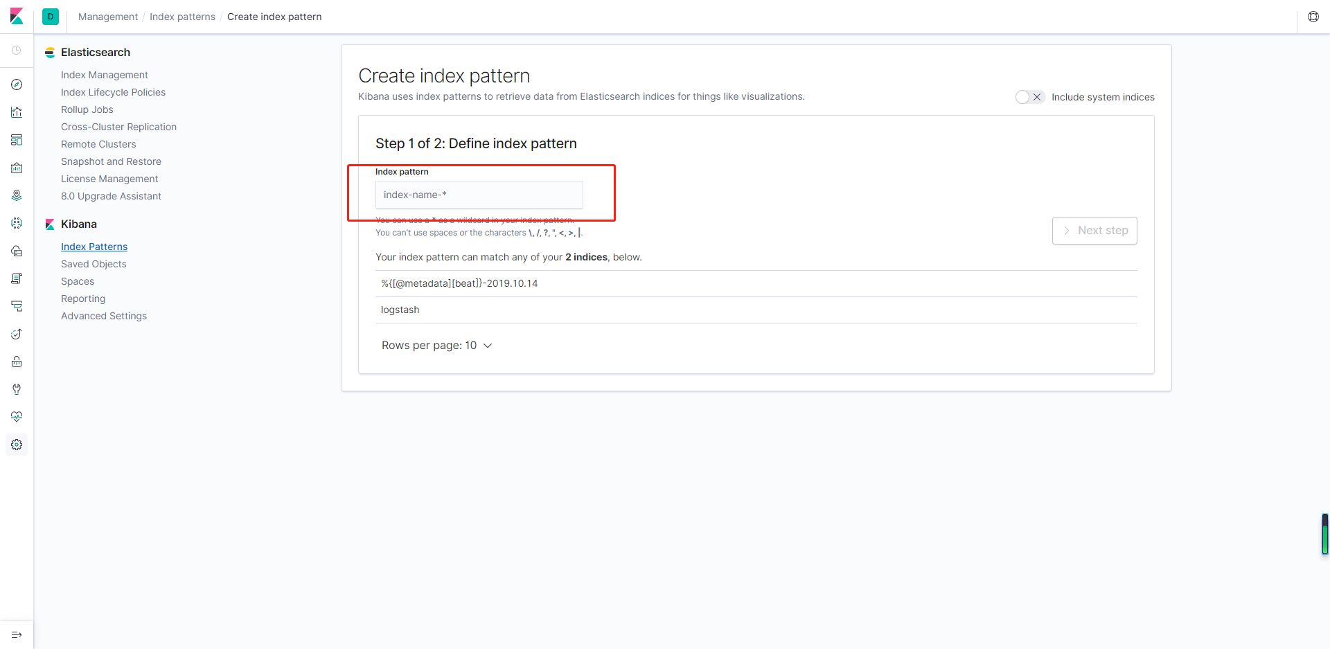 配置 index pattern,点击 Management ——> Index Patterns ——> Create index pattern