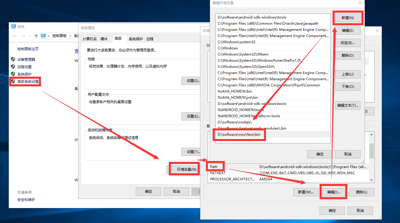 >配置系统环境(老方法这里就不细说了):在Path中添加D:\software\nox\Nox\bin; (夜神模拟器安装的bin目录)