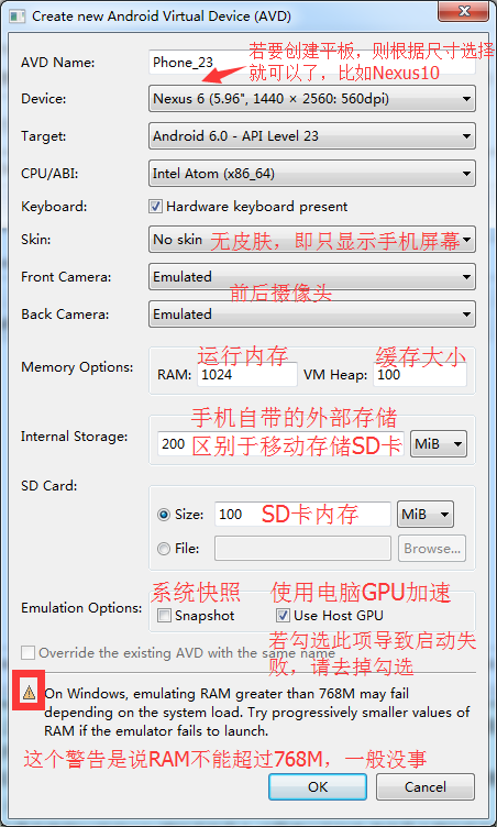 --Memory Option :RAM 运行内存,设置 512 就行,VM Heap 这个是 app 的运行内存默认设置的 64 就行