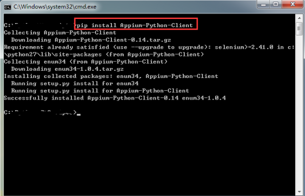 1.前面python环境安装,已经准备好pip了,所以这里直接打开cmd,输入:pip install Appium-Python-Client