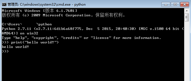 7.打开cmd输入python,出现版本号,然后输入print("hello world!")