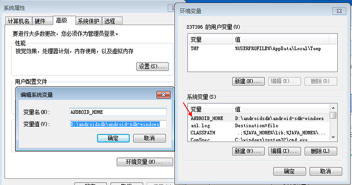 1.在系统变量新建:ANDROID_HOME,对应变量值为:D:\androidsdk\android-sdk-windows(sdk安装路径)