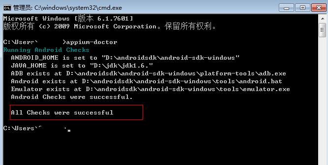 3.打卡cmd,输入appium-doctor,检查环境是否OK,出现如下图所示,说明环境OK