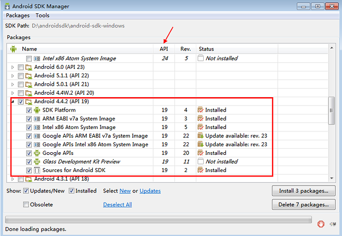 3.勾选你要下载的API版本和对应的android版本,后面模拟器会用到(不下载用其它模拟器也行,或者真机),然后坐等下载