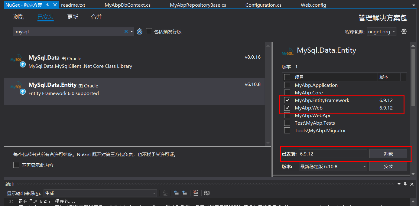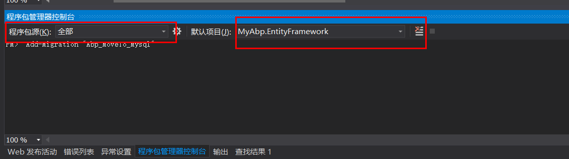 打开程序包管理控制台,程序包源选择全部,默认项目选择EntityFramework结尾的项目执行 Add-Migration "Abp_MoveTo_Mysql"