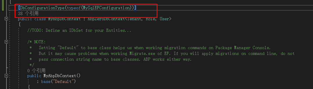 3.修改 EntityFramework结尾的项目中EntityFramework文件夹下DbContext结尾的类,添加:[DbConfigurationType(typeof(MySqlEFConfiguration))]