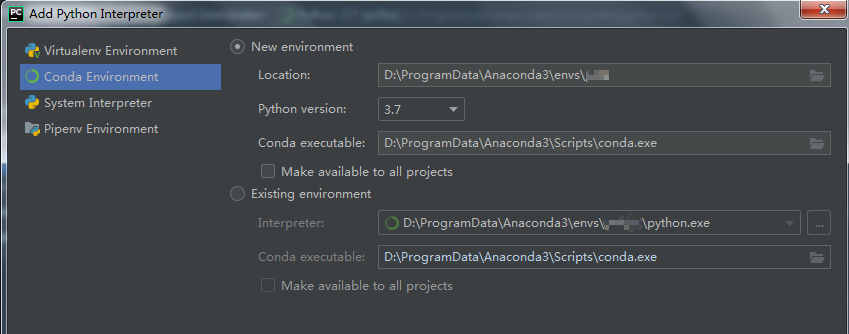 4.左侧有4种选择:Virtualenv Environment、Conda Environment、System Interpreter、Pipenv Environment ①其中System Interpreter如字面意思,系统里安装的本地Python作为解释器,一般很少用,不推荐; ②Pipenv Environment,只知道pip包的一个管理模块,不了解; ③说一下Virtualenv Environment和Conda Environment。网上其实有很多资料了,找了两天,我还是没看明白Virtualenv Environment和Conda Environment的区别到底在哪里。后来觉得也不用太纠结这个问题,先会用,满足学习和工作的需要就行,这才是工具最大的意义。后面在使用中一定会遇到很多坑,自己一点一点总结就可以了。 简单说,Virtualenv Environment使项目拥有独立的Python环境,各项目之间不会因为版本依赖、库依赖受到影响。