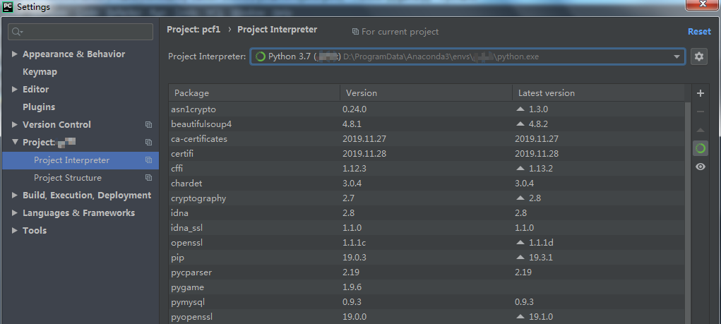 1.打开Pycharm中的Project Interpreter,菜单路径: File-->Settings-->Project-->Project Interpreter