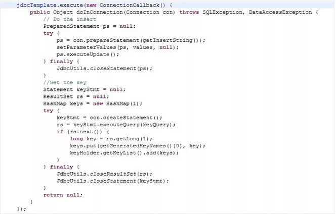 在这个回调对象中定义一个操纵JdbcTemplate中变量的方法,我们去实现这个方法,就把变化的东西集中到这里了。然后我们再传入这个回调对象到JdbcTemplate,从而完成了调用。这可能是Template Method不需要继承的另一种实现方式。