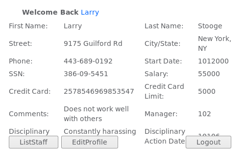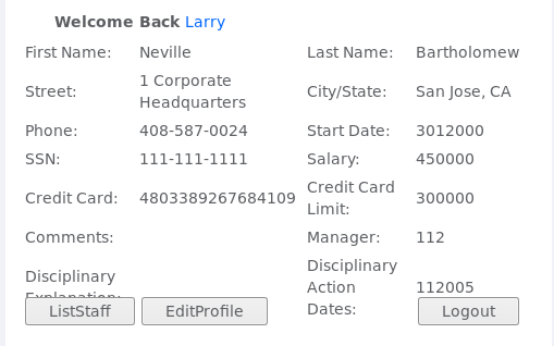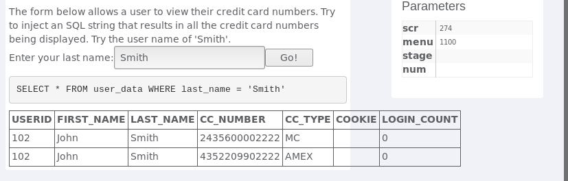 Smith' or 1=1--(Smith 和1=1都成了查询的条件,而1=1是恒等式,因此能查询到表里面的所有数据) - 得到所有用户的信用卡号码,攻击成功!