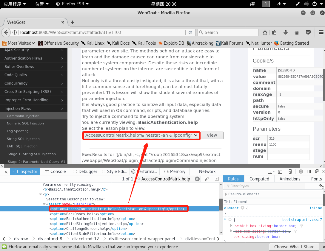 inspect Element审查网页元素对源代码进行修改,在复选框中任意一栏的代码,右键单击后,选择Edit At Html进行修改,添加"& netstat -an & ipconfig"
