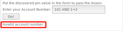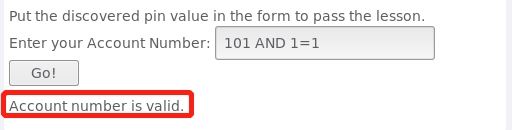 目标:该题目允许输入一个帐号,并检测该帐号是否合法。使用该表单的返回信息(真或假)测试检查数据库中其它条目信息。我们找到 pins 表中 cc_number 字段值为 1111222233334444 的记录中 pin 字段的数值。pin 字段类型为 int,整型。输入找到的数值并提交,通过该题目。