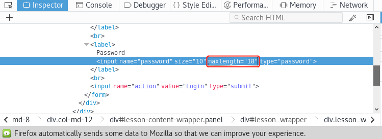 inspect Element审查网页元素对源代码进行修改,将password密码框的最大长度限制改为18。