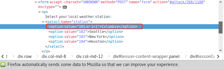 原理:在station字段中注入特征字符,组合成新的SQL语句。 如:SELECT * FROM weather_data WHERE station = [station]