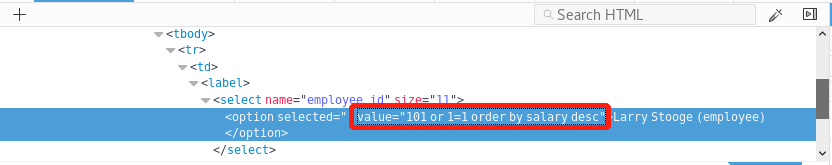 用社会工程学解释老板应该是工资最高的,所以将员工ID的value改成101 or 1=1 order by salary desc,使得老板的信息作为查询到的第一条数据。