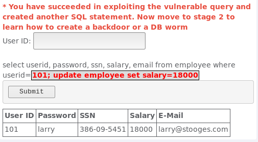 目标:利用查询的脆弱性创建触发器。由于 WebGoat 使用的是 MySQL 数据库,不支持触发器,所以该课程不会真正完成。 我们的 Login ID 是 101。