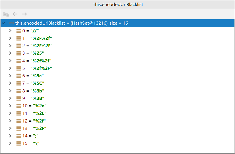 其中有个encodedUrlBlacklist就是所有的非法字符黑名单了,这儿会过滤所有非法字符,我们debug看下里面有哪些