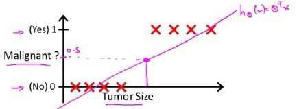 得一条新的直线。这时,再使用0.5 作为阀值来预测肿瘤是良性还是恶性便不合适了。可以看出,线性回