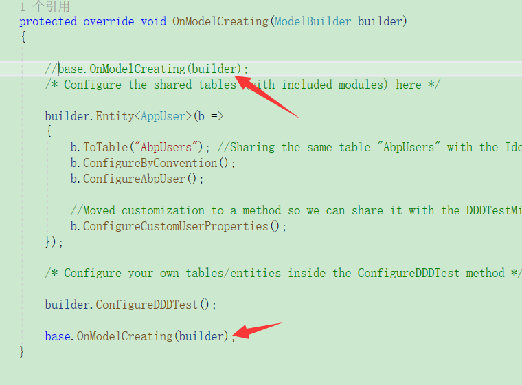 这个时候只需要把 base.OnModelCreating(builder);,移到builder.ConfigureDDDTest();下面即可