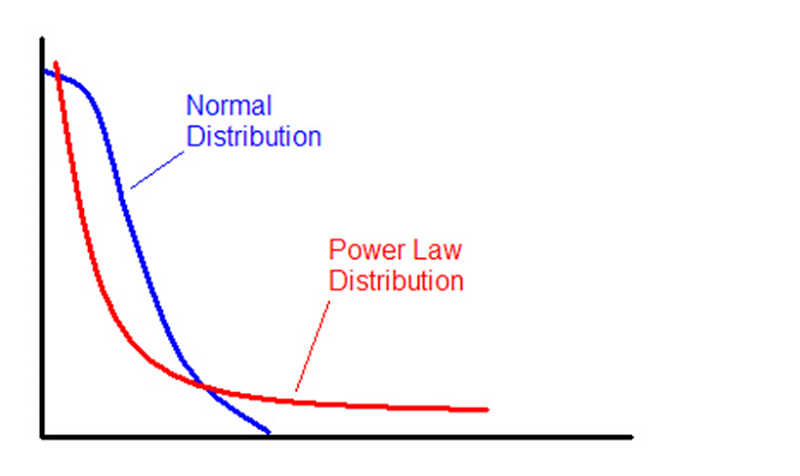(图中横坐标代表每个人的财富,纵坐标代表有这么多财富的人数。两种分布最大的差异在于横轴上距离原点很远处:在财富特别高的地方,幂律分布预言的个体个数,比正态分布要多很多。)