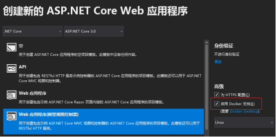 创建一个ASP.NET Core Web应用程序,选中启用Docker支持。自动帮我们创建一个Dockerfile文件。