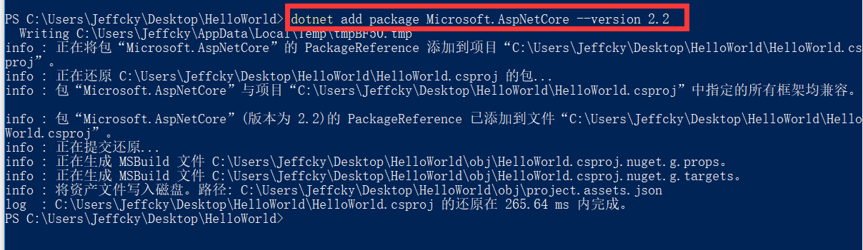 我们通过命令创建一个.NET Core控制台程序,接下来为了在页面上输出Hello World,我们需要使用中间件,所以我们添加AspNetCore包,如下: