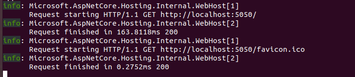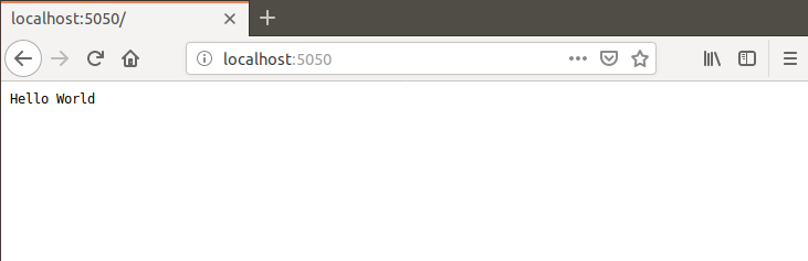 从上述我们可看到容器已正常启动,且运行环境为生产环境,监听端口为5050。桌面版ubuntu默认为我们安装了火狐浏览器,此时我们打开浏览器将会输出Hello World,如下: