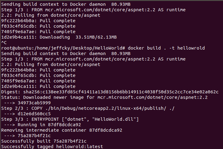 父镜像为.NET Core 2.2版本和我们创建的程序版本一致,然后将我们的应用程序(即publish目录)拷贝,最后指定程序运行的命令和参数。有了Dockerfile文件,那么我们就可以开始构建镜像了,终端继续运行如下命令(注意:镜像标签名称必须全部为小写,否则报错):