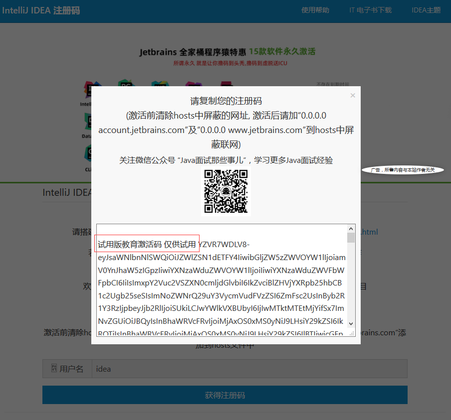 激活后请将 0.0.0.0 account.jetbrains.com 和 0.0.0.0 www.jetbrains.com 添加到hosts文件中。
