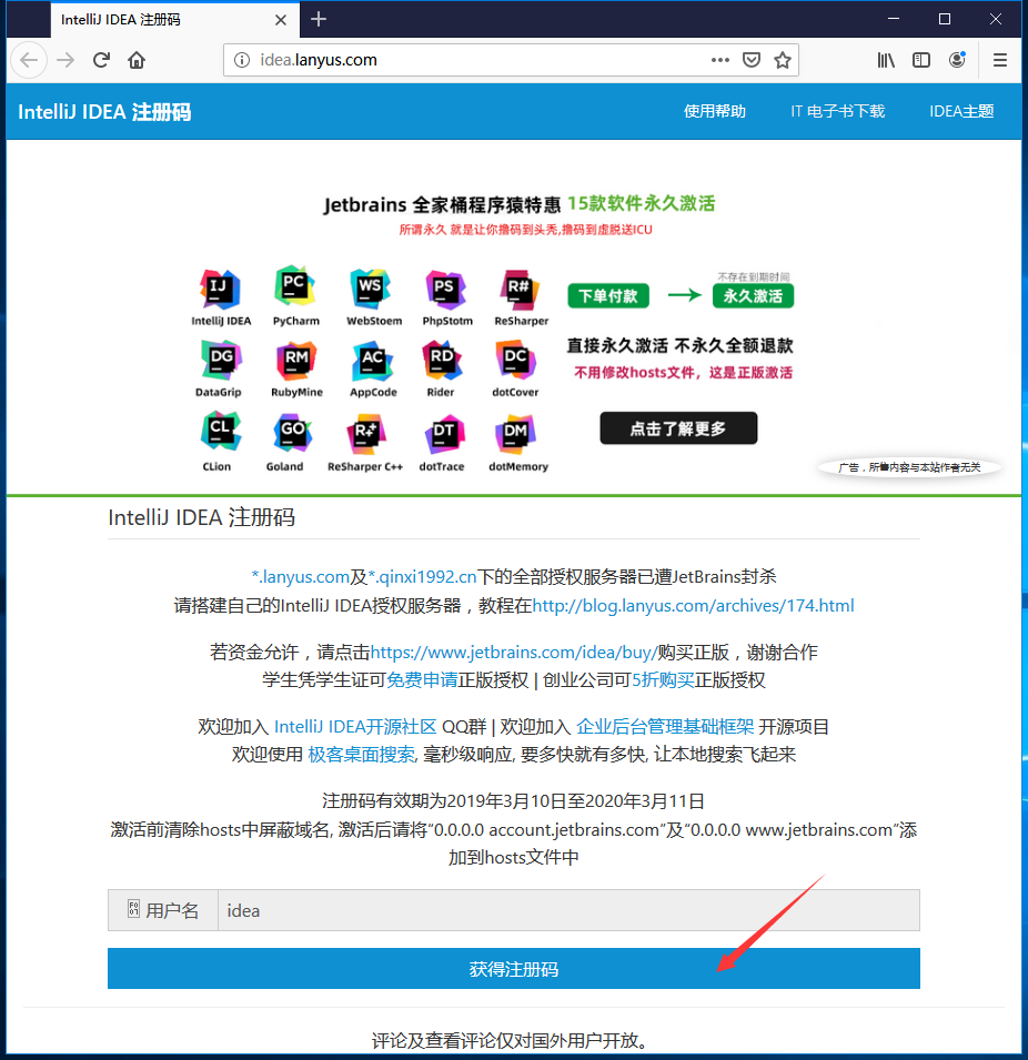 (2)第16步,安装包提供的注册码已经过期,前往 http://idea.lanyus.com/ 获取注册码。