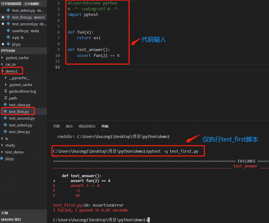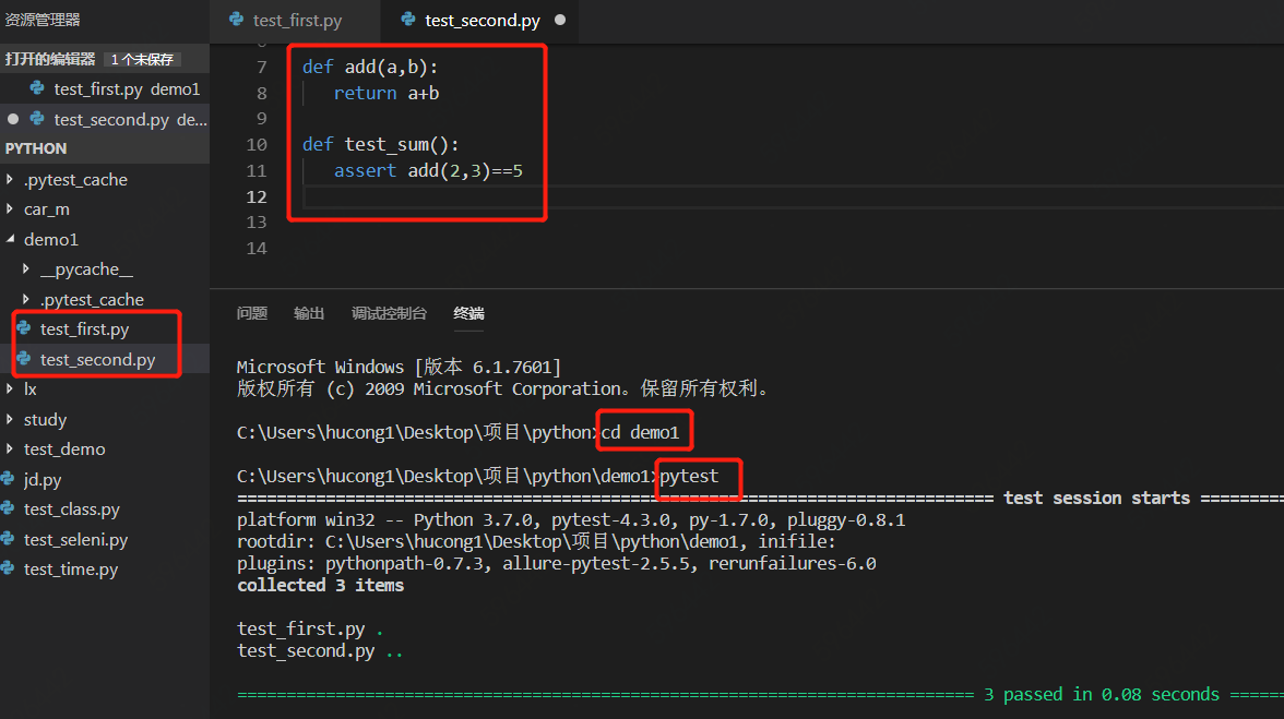 6. 执行文件下指定的测试脚本,命令为pytest -q 指定测试脚本名称【cd到对应文件下执行】 或者 pytest 文件名/脚本名