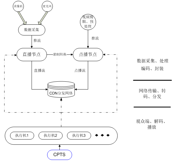 CPTS利用执行机模拟大量并发用户的客户端向CDN或者源站发起请求,模拟拉流操作,CDN或者源站在收到请求后,会将响应报文返回至CPTS压测执行机,以HLS协议点播为例,CPTS压测执行机通过对CDN或者源站发起请求,得到m3u8索引文件,按序请求下载获取每一段ts数据流。解析对应的ts流,实时计算视频的帧率、码率、首包用时和首帧用时,之后还将利用异步线程模拟播放流媒体文件,识别视频是否出现卡顿和花屏,模拟CDN或者源站在高压力场景下,客户端收到视频流在实际播放过程中是否会产生的问题。